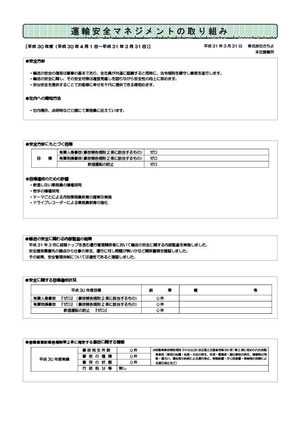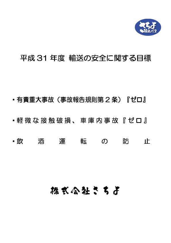 (1)輸送の安全の確保は事業の基本であり、全社員が共通に認識すると同時に、法令規則を順守し業務を遂行します。 (2)輸送の安全に関し、その安全対策は適宜見直しを図りながら安全性の向上に努めます。 (3)安心安全を提供することでお客様に幸せを千代に提供できる様努めます。